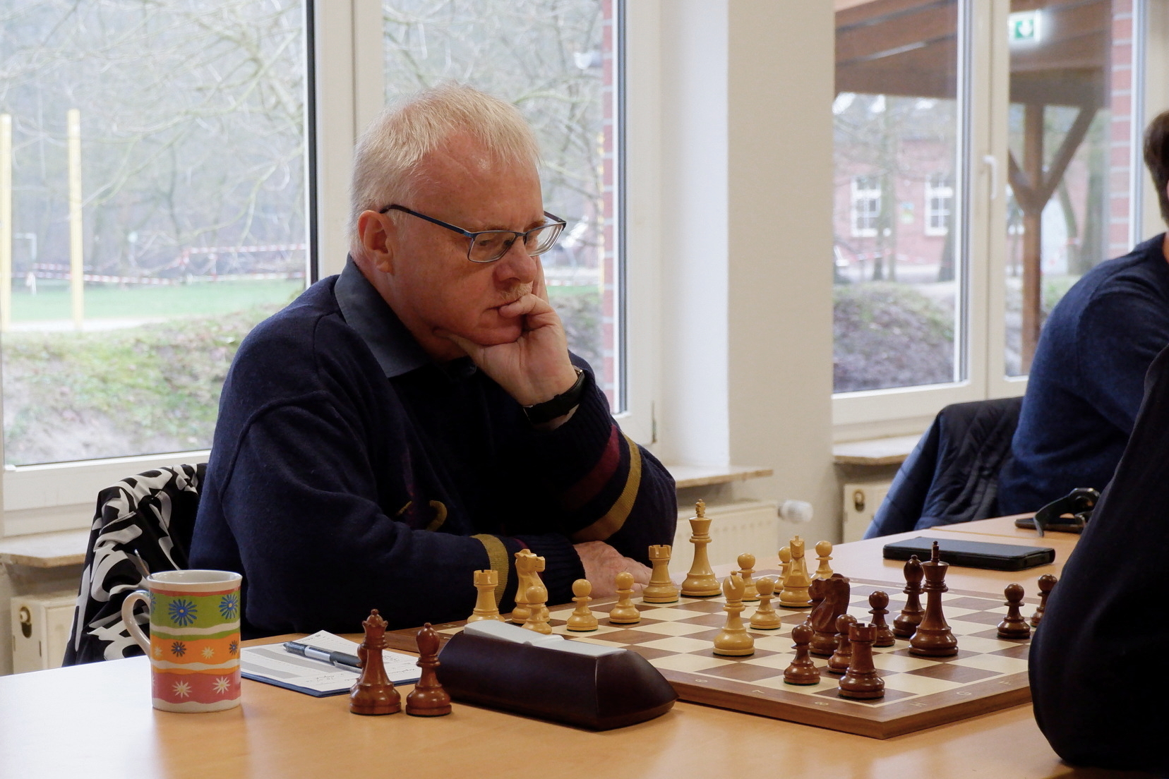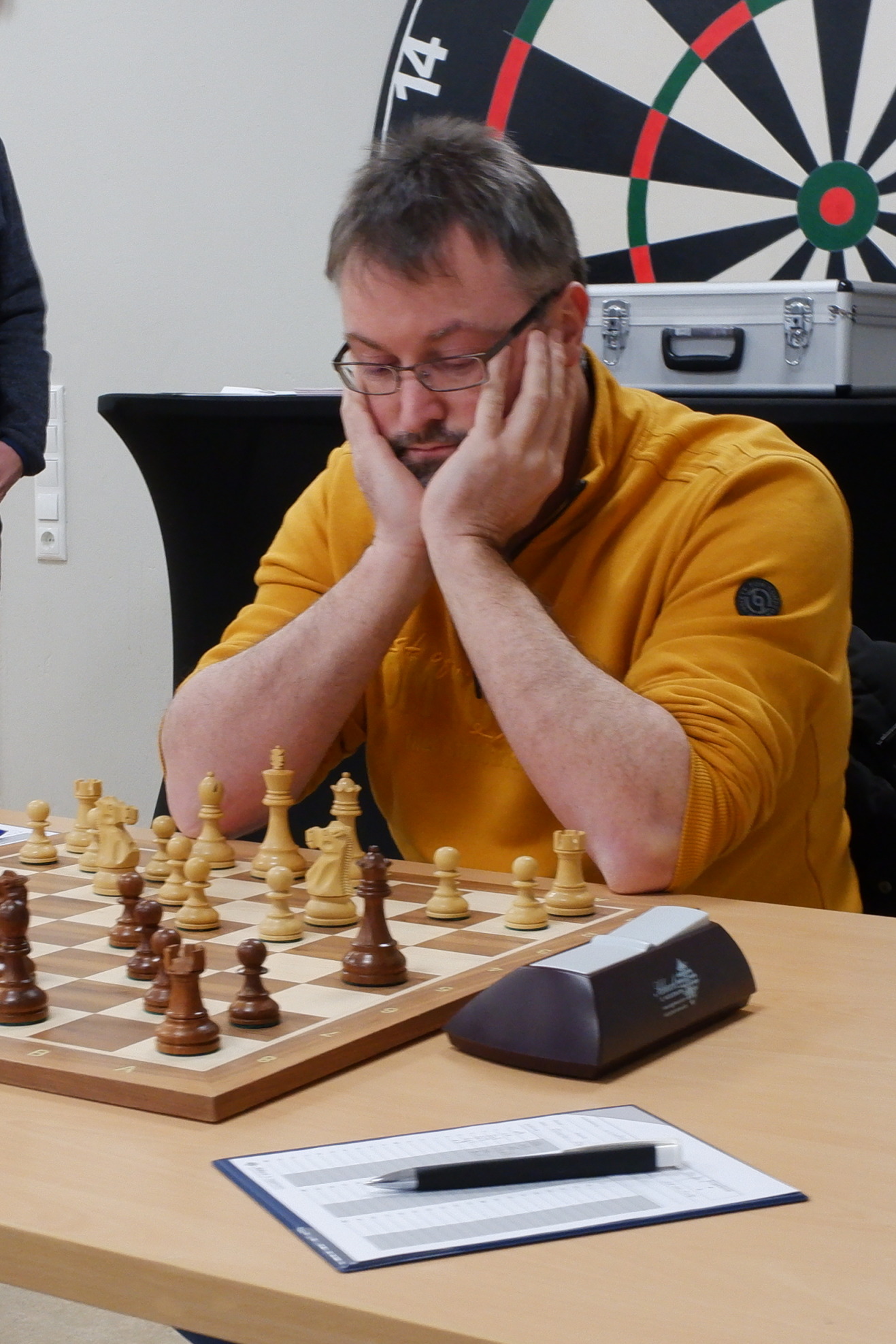 Uwe Rau steuerte ein Remis bei. Es war immer Spannung in der Stellung, die aber keiner zu seinem Vorteil nutzen konnte. Es tauschte sich zu einem remisen Turm-Springer Endspiel ab. (2½:½)