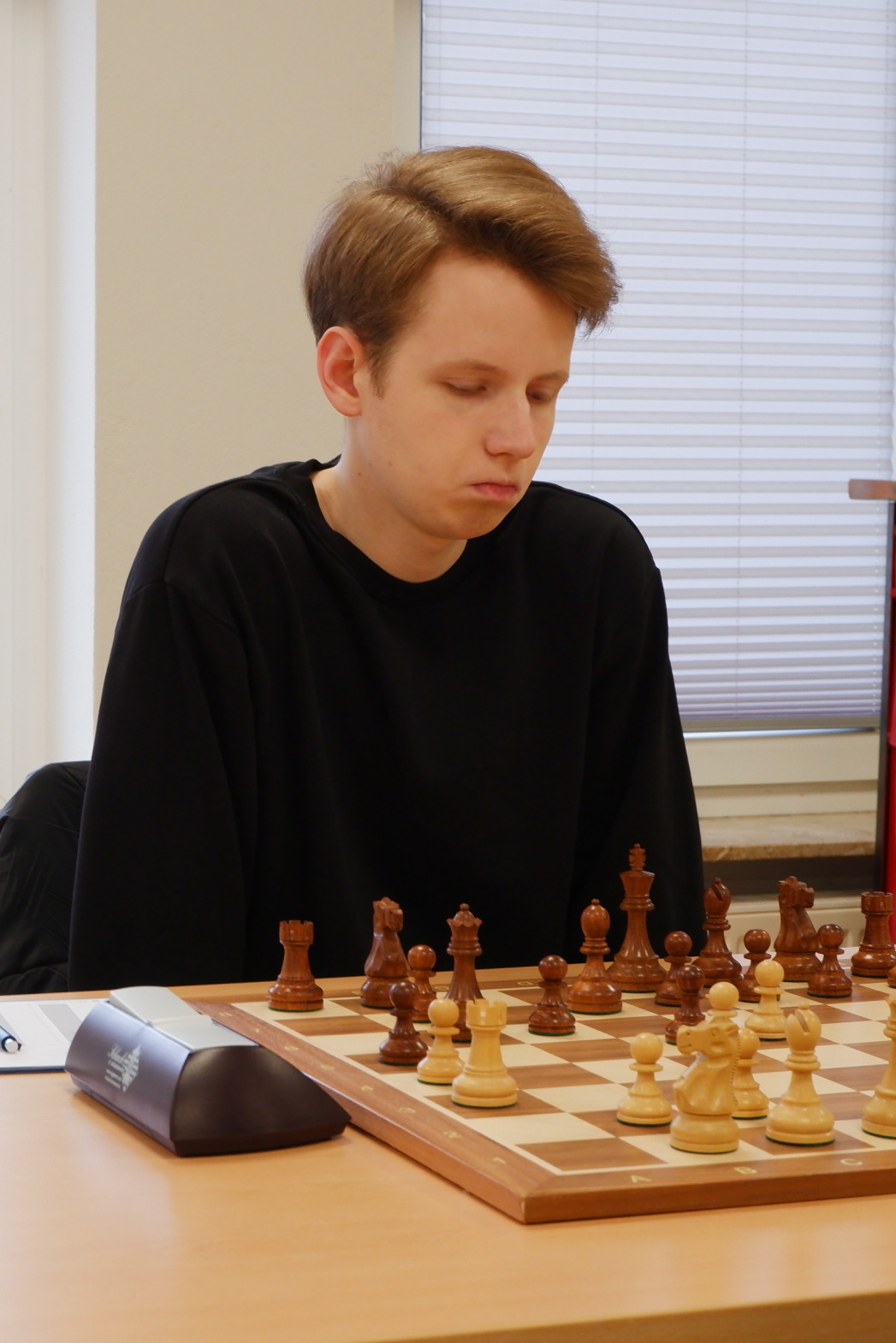 Florian Mescher spielte von Anfang bis Ende eine saubere Partie und baute im Mittelspiel Zug um Zug seinen Vorteil aus. In der folgenden Stellung konnte sein Gegner Figurenverlust nicht mehr vermeiden.