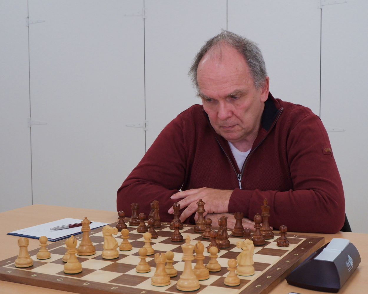 Ich war die ganze Zeit über am Drücker und konnte mit meinen Türmen in die gegnerische Stellung eindringen. An einer Stelle zog ich aber zu schnell und machte nur den zweit- oder drittbesten Zug. Damit war ein mein Vorteil größtenteils hin. Mein Gegner bekam Gegenspiel. In einem komplizierten Turmendspiel ging ich dann, auch mit Hinblick auf den Stand der Mannschaft, in eine Zugwiederholung. (4:1)
