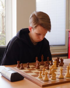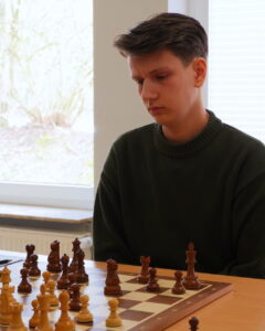 Den nächsten vollen Punkt holte Tammo Aden. Bei ihm ging die Partie bis ins Endspiel. Sein Gegner machte einige ungewöhnliche Bauernzüge, die ihm zwar Raum einbrachten, seine Stellung aber auch anfällig machten. Tammo brach im Zentrum durch und konnte den ungeschützten gegnerischen König angreifen. Die Stellung war nicht mehr zu halten. (2:0)