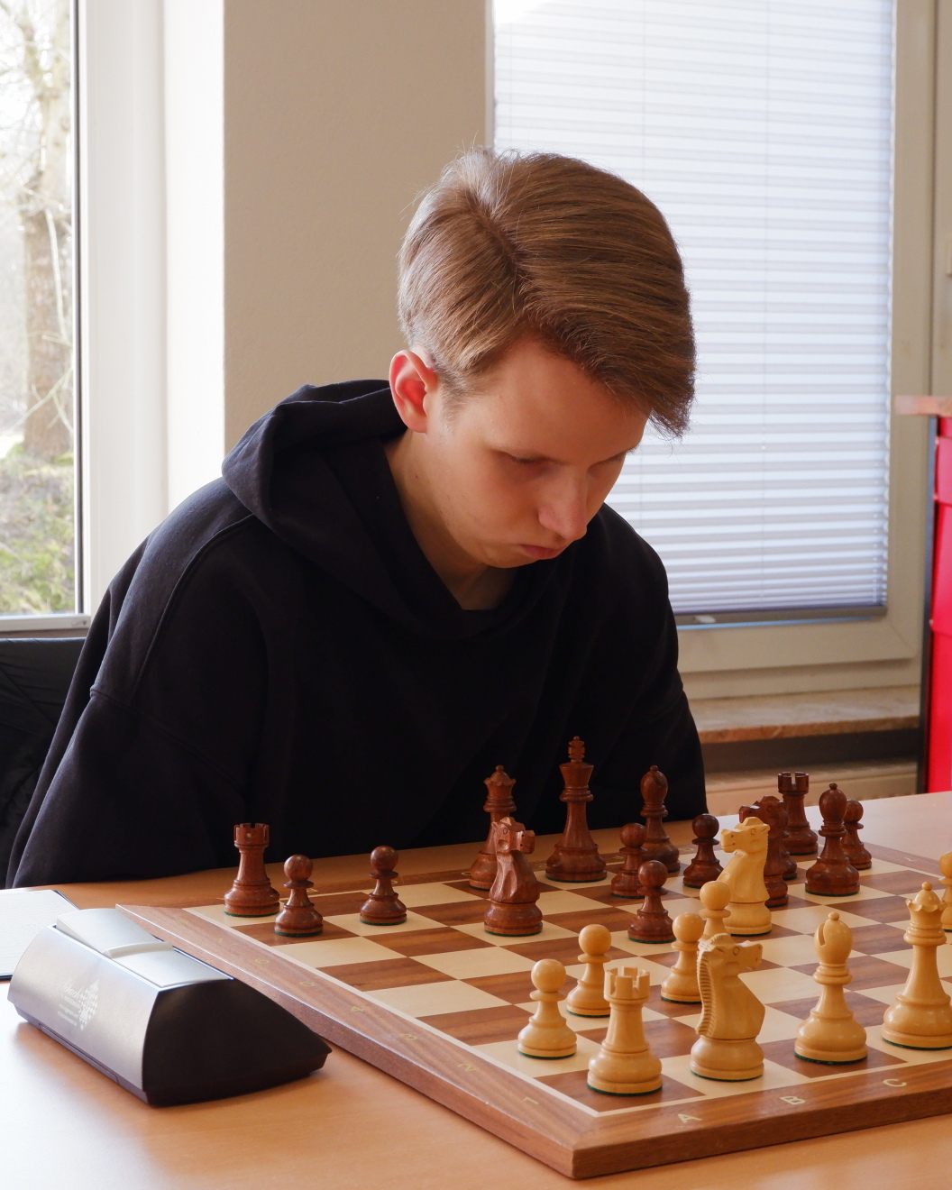 Es ging gleich gut los. Der Gegner von Florian Mescher verrechnete sich und verlor nach 20 Zügen einen Turm. (1:0)